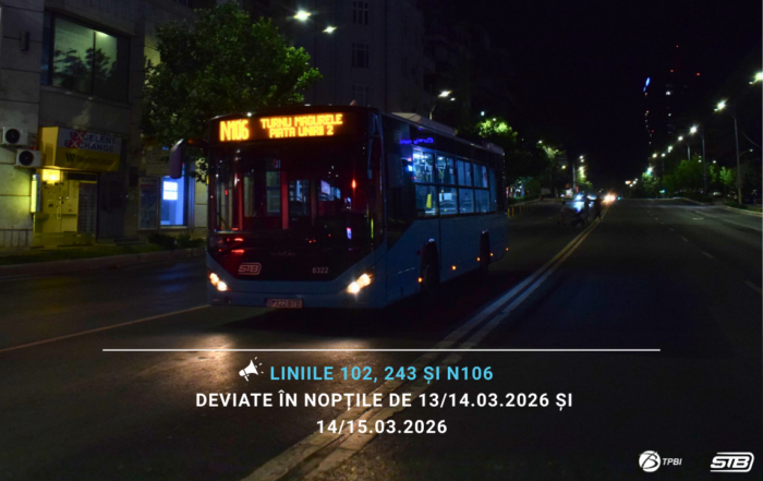 Liniile 104, 123, 205, N110 și N115 vor funcționa pe trasee modificate în perioada 12.03.2026 (ora 23:00)-13.03.2026 (ora 05:00), ca urmare a restricționării traficului rutier pe Splaiul Independenței (malul drept), tronsonul cuprins ȋntre Piața Naţiunile [...]