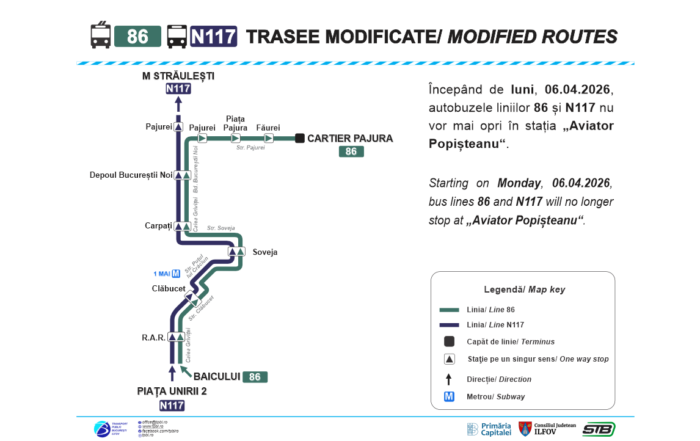 Începând de luni, 06.04.2026, liniile 86 și N117 vor fi modificate, vehiculele urmând să circule pe sensurile spre „Cartier Pajura”, respectiv „M Străulești” pe Strada Puțul lui Crăciun. Asociația de Dezvoltare Intercomunitară pentru Transport Public [...]