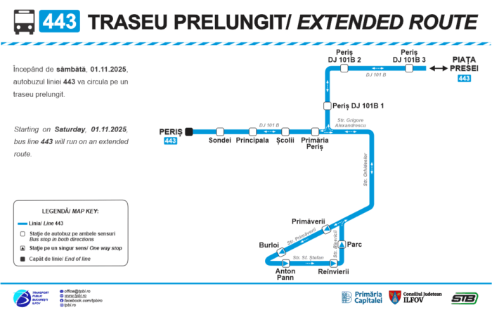 Începând de sâmbătă, 01.11.2025, autobuzele liniei 443 vor circula pe un traseu prelungit pe sensul spre „Piața Presei”, de la actualul capăt, „Periș”, pe Str. Grigore Alexandrescu, Str. Orhideelor, Str. Primăverii, Str. Sf. Ștefan, cu [...]