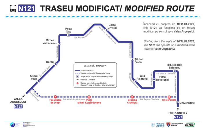 Asociația de Dezvoltare Intercomunitară pentru Transport Public București – Ilfov (TPBI) a dispus ca, începând cu noaptea de 10/11.01.2026, linia N121 să funcționeze pe un traseu modificat, pe sensul spre terminalul „Valea Argeșului”, astfel: de [...]