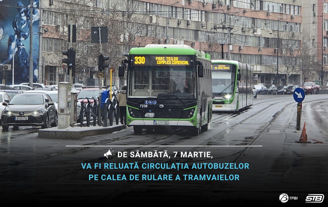 Începând de sâmbătă, 7 martie 2026, va fi reluată circulația autobuzelor pe calea de rulare a tramvaielor, inclusiv cu efectuarea stațiilor la peroanele de tramvai, acolo unde a fost astfel stabilit.