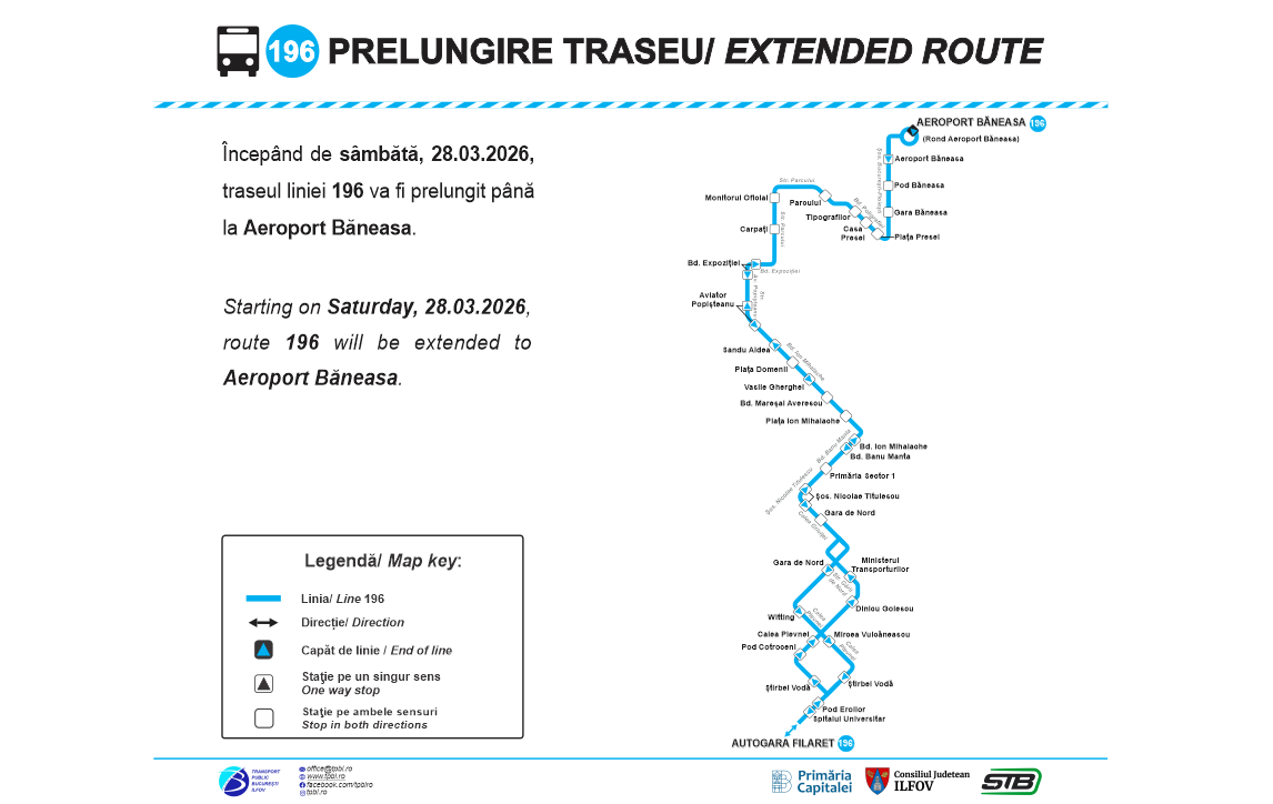 Asociația de Dezvoltare Intercomunitară pentru Transport Public București – Ilfov (TPBI) prelungește, de sâmbătă, 28 martie 2026, traseul liniei 196, autobuzele urmând să asigure o legătură directă între trei noduri importante de transport, și anume Aeroportul Băneasa, Gara de Nord și Autogara Filaret.