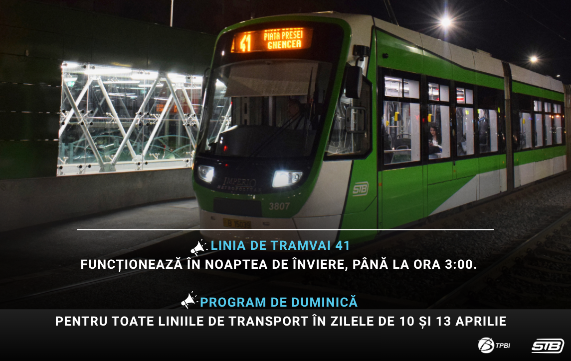 În Noaptea de Înviere, linia de tramvai 41 va avea un program de funcționare prelungit, cu ultima plecare la ora 02:20, din terminalul Piața Presei. Tramvaiele vor circula la un interval de succedare de 20 de minute, începând cu ora 23:20.