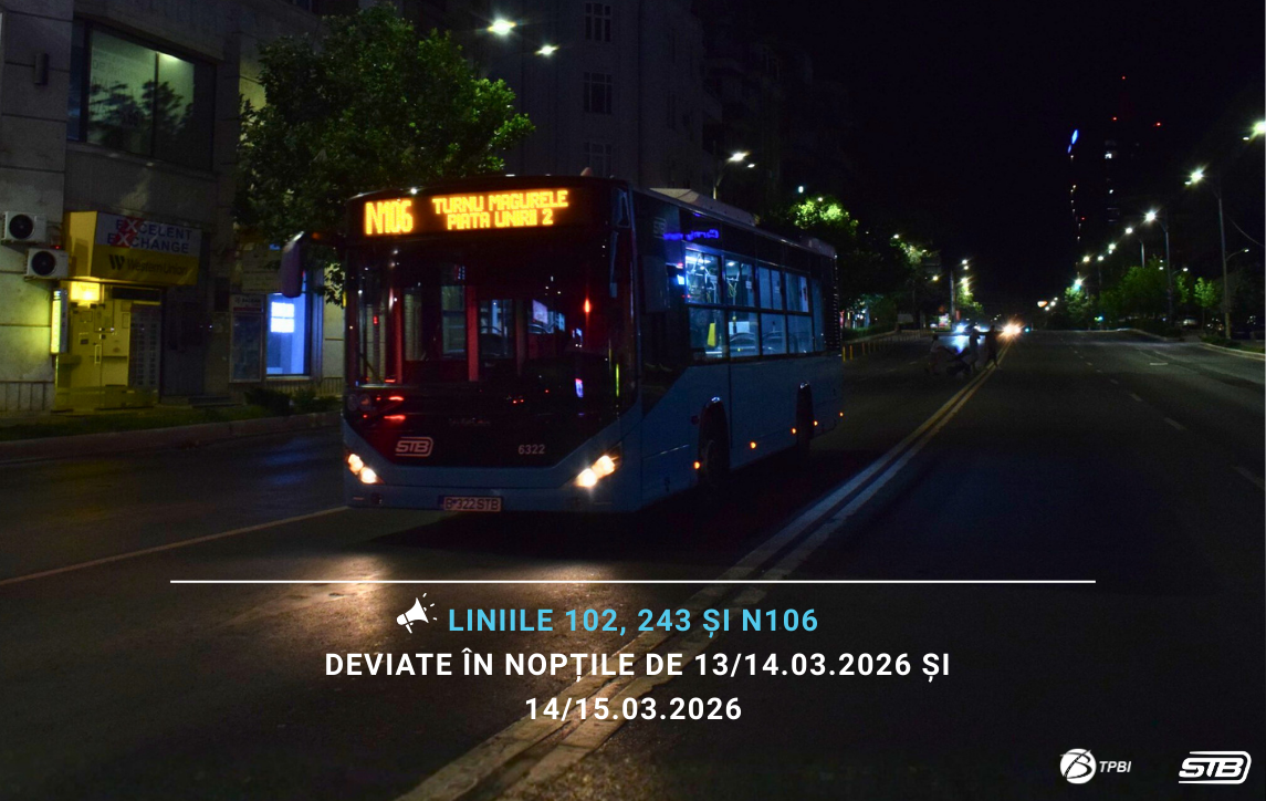 Liniile 102, 243 și N106 vor funcționa pe trasee modificate în nopțile de 13/14.03.2026 și 14/15.03.2026, în intervalul orar 23:00-05:00, ca urmare a restricționării traficului rutier pe Strada Sergent Ion Iriceanu (tronsonul cuprins ȋntre Aleea Sergent Major Holuț Emil și Șoseaua Berceni, pe sensul de mers către Strada Turnu Măgurele), pentru montarea grinzilor aferente pasajului rutier din intersecția Str. Sergent Ion Iriceanu/ Șos. Berceni/ Str. Turnu Măgurele.