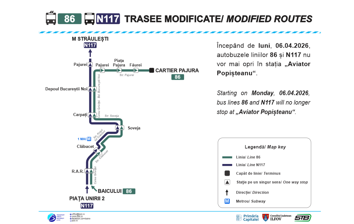 Pe noul traseu, vehiculele liniilor 86 și N117 nu vor mai efectua stația „Aviator Popișteanu”.
