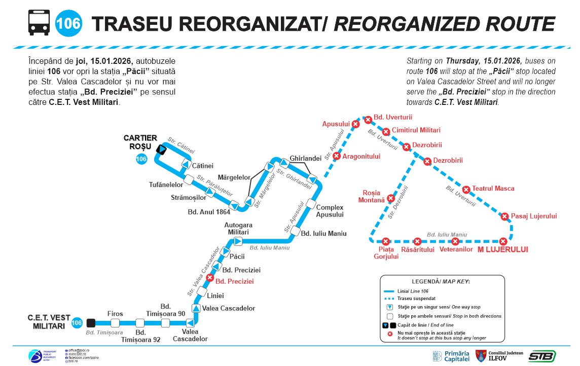 De la aceeași dată, autobuzele liniei 106 vor opri, pe sensul spre „CET Vest Militari”, și în stația „Păcii”, situată pe Strada Valea Cascadelor, iar stația „Bd. Preciziei” va fi suspendată.