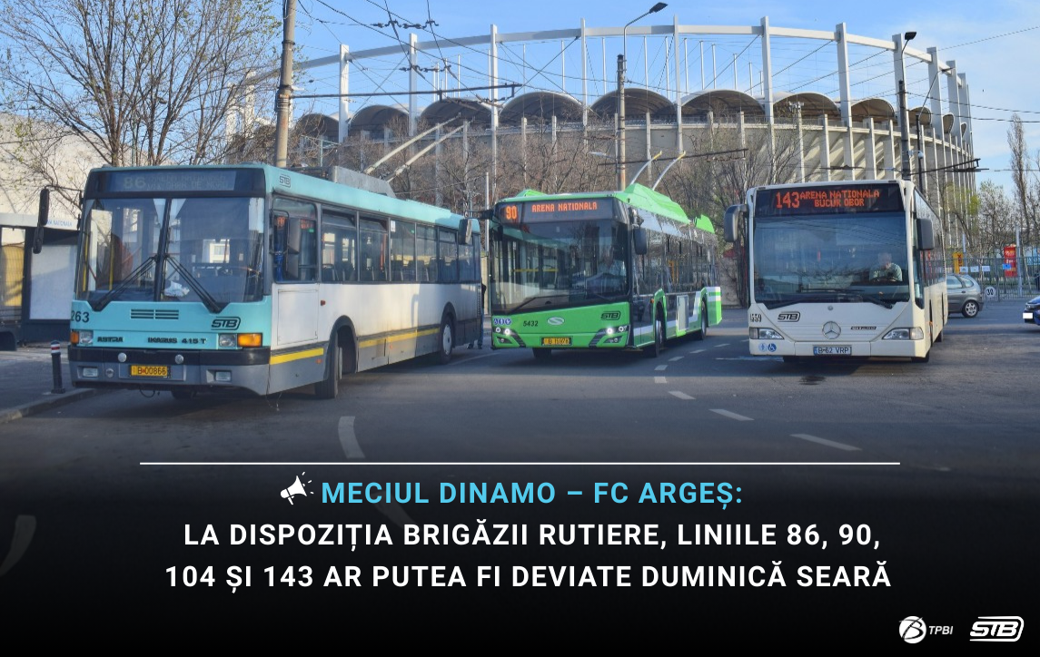 Având în vedere desfășurarea meciului de fotbal Dinamo București – FC Argeș Pitești, programat duminică, 01.03.2026, de la ora 18:00, pe Arena Națională, pot fi aplicate modificări temporare în circulația unor linii de transport public.