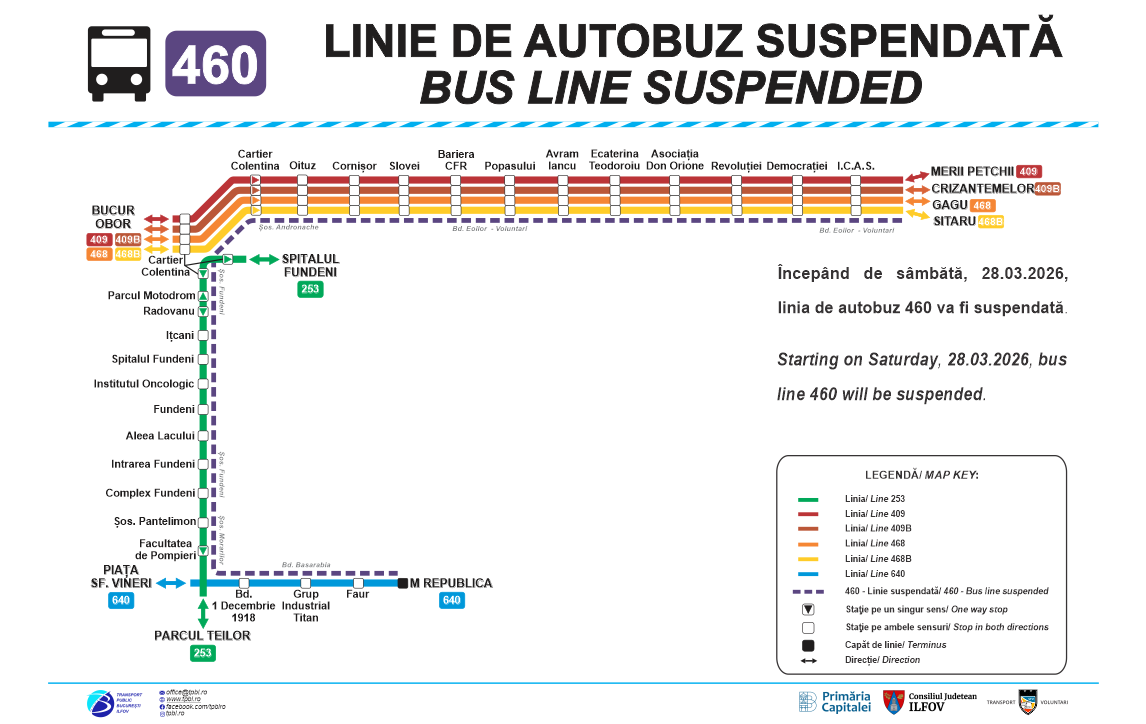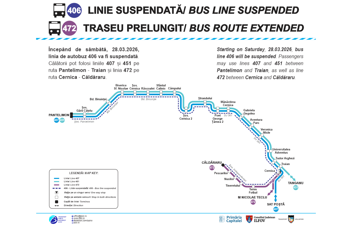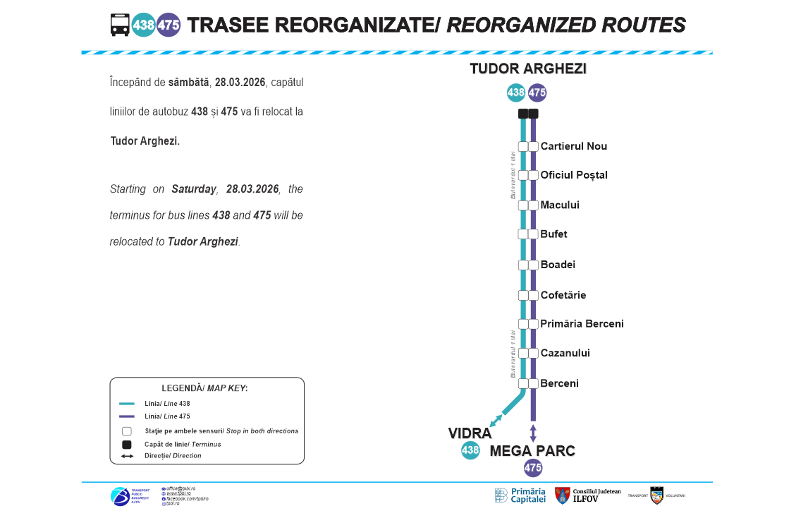 Începând de sâmbătă, 28.03.2026, o parte a rețelei de transport metropolitan din Regiunea București – Ilfov va fi reorganizată, nouă linii urmând să fie modificate, iar trei suspendate. Totodată, două linii vor fi operate de Serviciul Transport Voluntari – STV SA, fiind preluate de la Societatea de Transport București – STB SA.