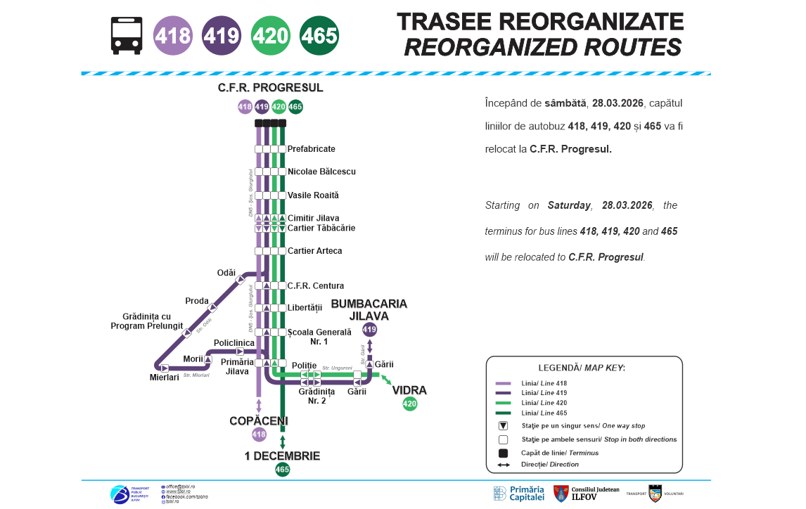 – Liniile 418, 419, 420 și 465 vor avea capătul la CFR Progresul, în loc de Piața Eroii Revoluției.