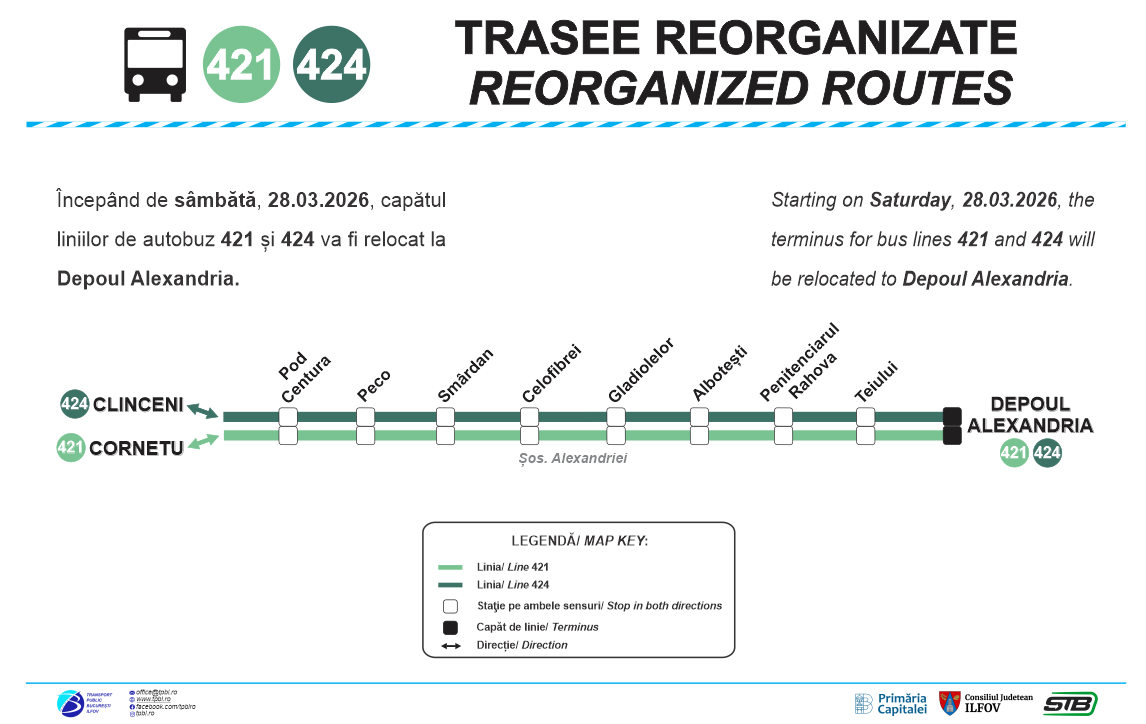– Liniile 421 și 424 vor avea capătul la Depoul Alexandria, în loc de Ghencea.