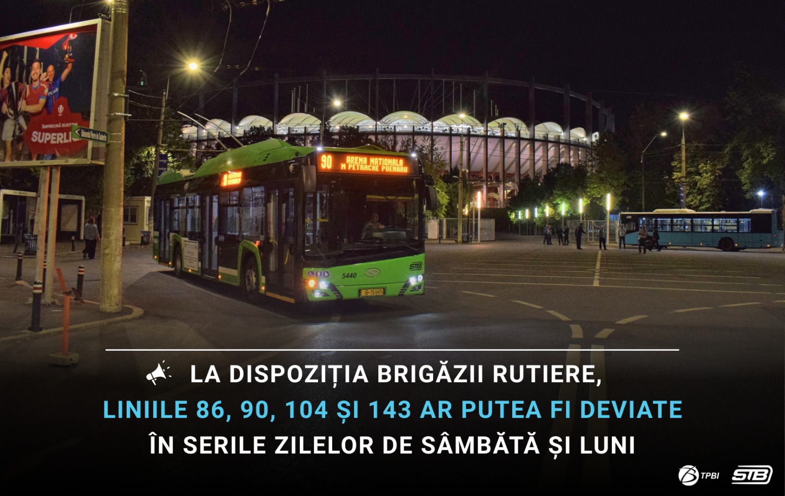 Pentru a permite participarea în siguranță a publicului la meciurile de fotbal Rapid București – Dinamo București (programat sâmbătă, 21.02.2026, de la ora 20.30) și FCSB – Metaloglobus (programat luni, 23.02.2026, de la ora 20.00), numai dacă situația o va impune, la dispoziția Brigăzii Rutiere de Poliție, vehiculele liniilor 86, 90 și 143 nu vor mai întoarce la „Arena Națională”, iar cele ale liniei 104 vor fi deviate pe Șoseaua Iancului.