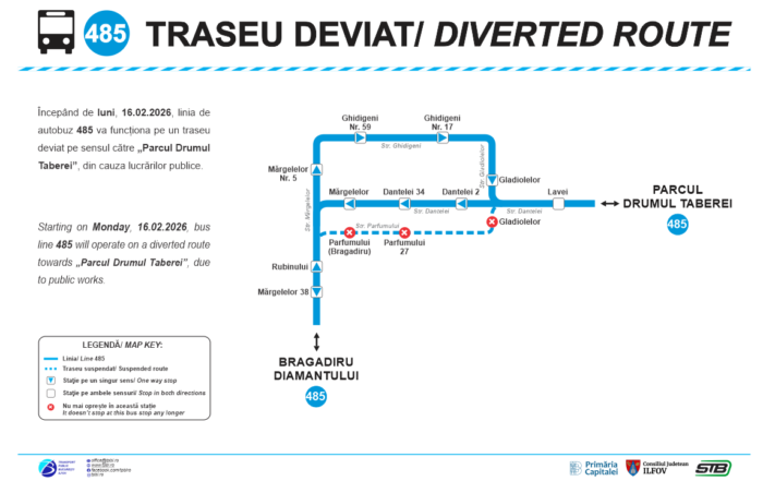 Începând de luni, 16.02.2026, autobuzele liniei 485 vor circula pe un traseu modificat pe sensul spre „Parcul Drumul Taberei”, ca urmare a executării lucrărilor de extindere a rețelei de apă potabilă și de canalizare pe [...]