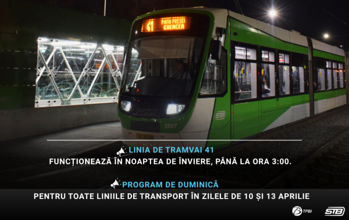 În Noaptea de Înviere, linia de tramvai 41 va avea un program de funcționare prelungit, cu ultima plecare la ora 02:20, din terminalul Piața Presei. Tramvaiele vor circula la un interval de succedare de 20 [...]